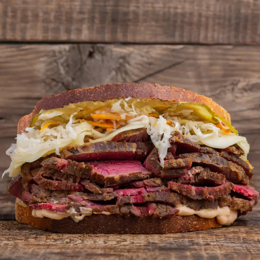 A delicate sandwich with Pastrami delicatessen – an Aberdeen Angus marbled beef that is prepared within 16 days: marinated, smoked and slowly cooked. Strong Sandwich includes high-quality rye bread, sliced Pastrami, Dutch cheese, mustard, sauerkraut, pickles, and Russian dressing.