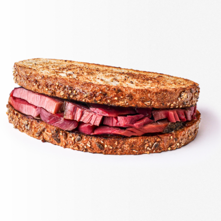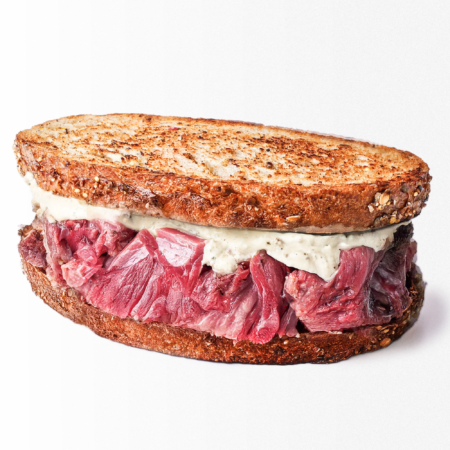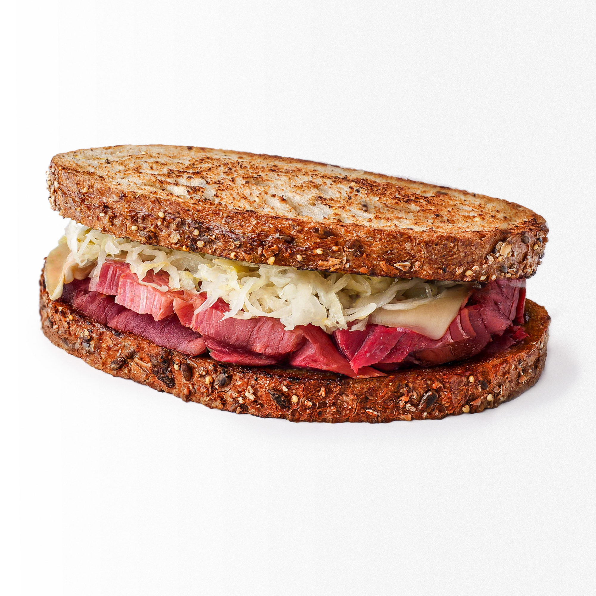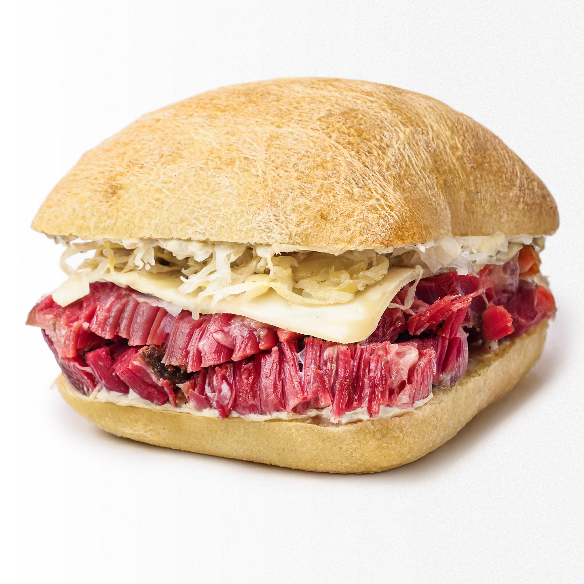 Multi grain rye bread or hot Ciabatta, layered with 7 oz of 14-day house-cured and 12-hour smoked pastrami, topped with rich Dutch cheese, flavorful sauerkraut, and crunchy pickles. Finished with our house-made Russian dressing and deli mustard, this sandwich packs a punch that will keep you coming back for more!